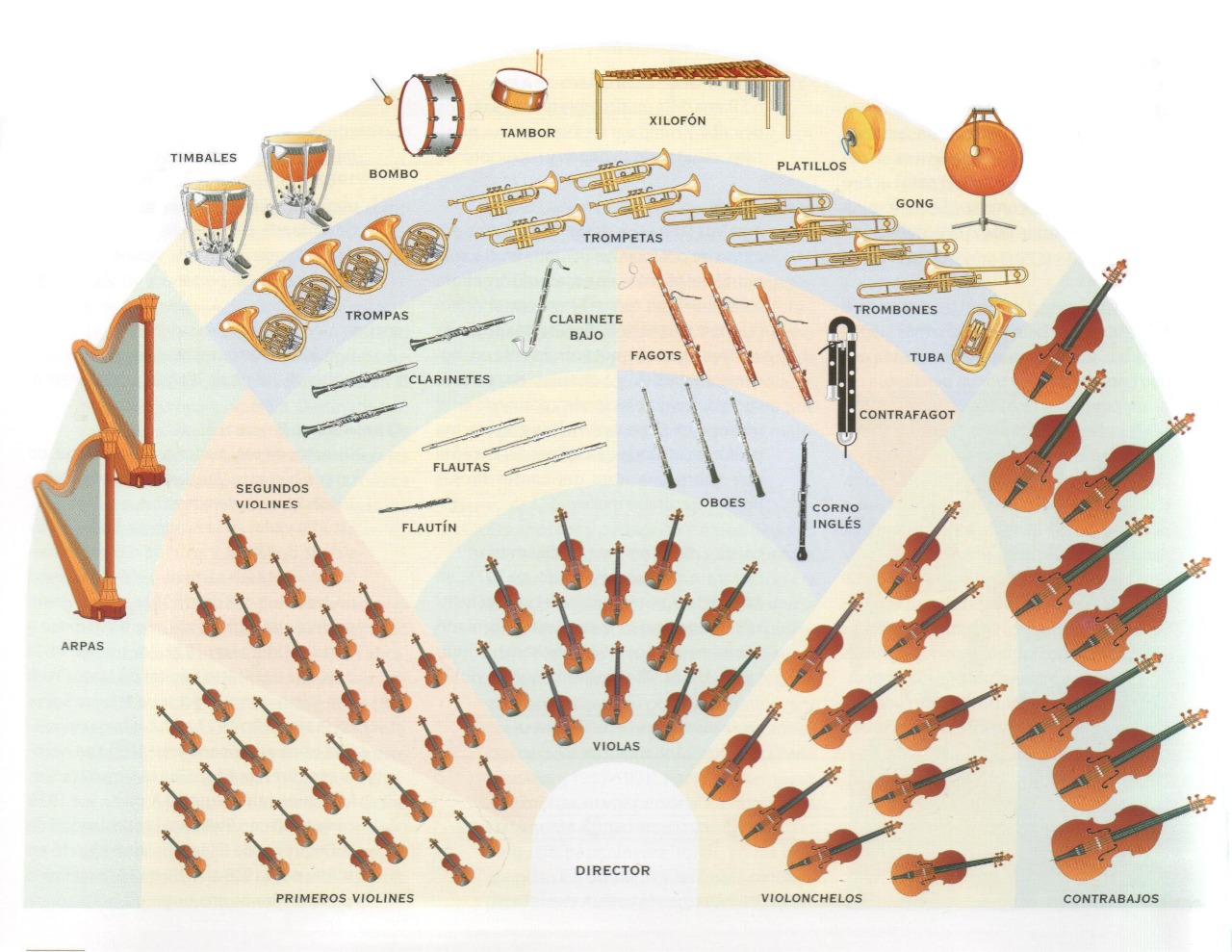 Los " Primeros violines " están situados en primera fila a la izquierrda del director. Los " Segundos Violines " estarian situados a la derecha de los " Primeros Violines " en la Orquesta.